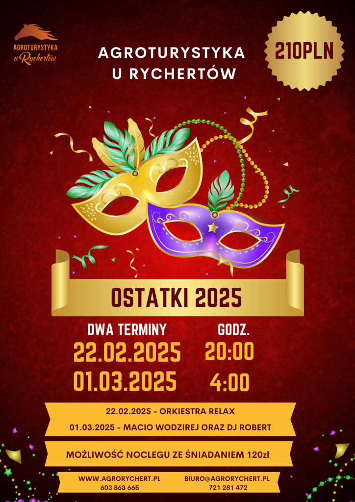 Zapraszamy na bal karnawałowy z okazji ostatków! Impreza z napojami gazowanymi oraz niegazowanymi. Koszt to 210 zł/osoba. Nocleg oraz śniadanie w pokoju 2 os. – 120 zł/os. Zniżki przewidziane przy pokojach większych niż 2 osobowych.