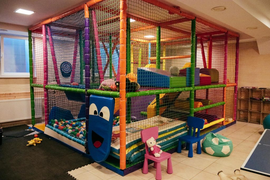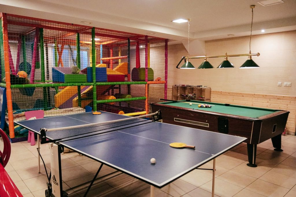 Pokój zabaw to kolorowa bawialnia wewnątrz i na świeżym powietrzu z kulkami, cymbergajem, stołem do tenisa i bilardem. Jednocześnie w ogrodzie działa tyrolka, która dostarcza dreszczyku emocji najmłodszym. Ponadto gospodarze organizują animacje dla dzieci, warsztaty plastyczne i małe konkursy, dlatego jest to idealne miejsce do rozwijania wyobraźni maluchów. Dodatkowo bawialnia wyposażona jest w udogodnienia dla dzieci, takie jak krzesełka do karmienia i stoliki do kolorowania.